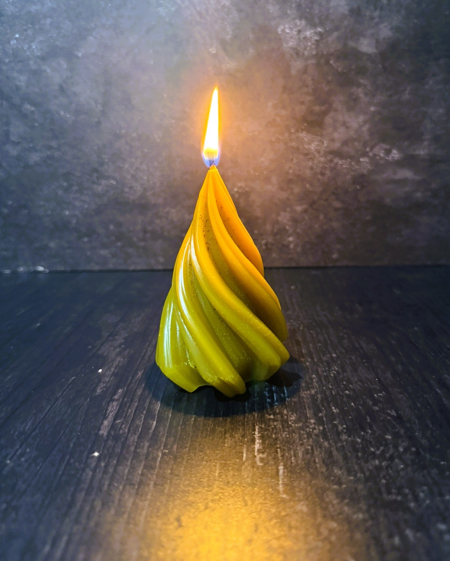Con un diseño dinámico y envolvente, Tornado destaca por su forma en espiral que proyecta una llama firme y elegante. Fabricada artesanalmente con cera de abeja pura, ofrece una experiencia cálida y natural.